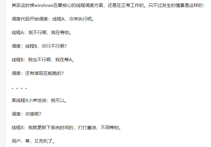 比如在Windows操作系统内核中,就有大量的全局性的锁,一个不小心造成死锁,其他想要的线程都得进入等待队列,那就凉凉了。