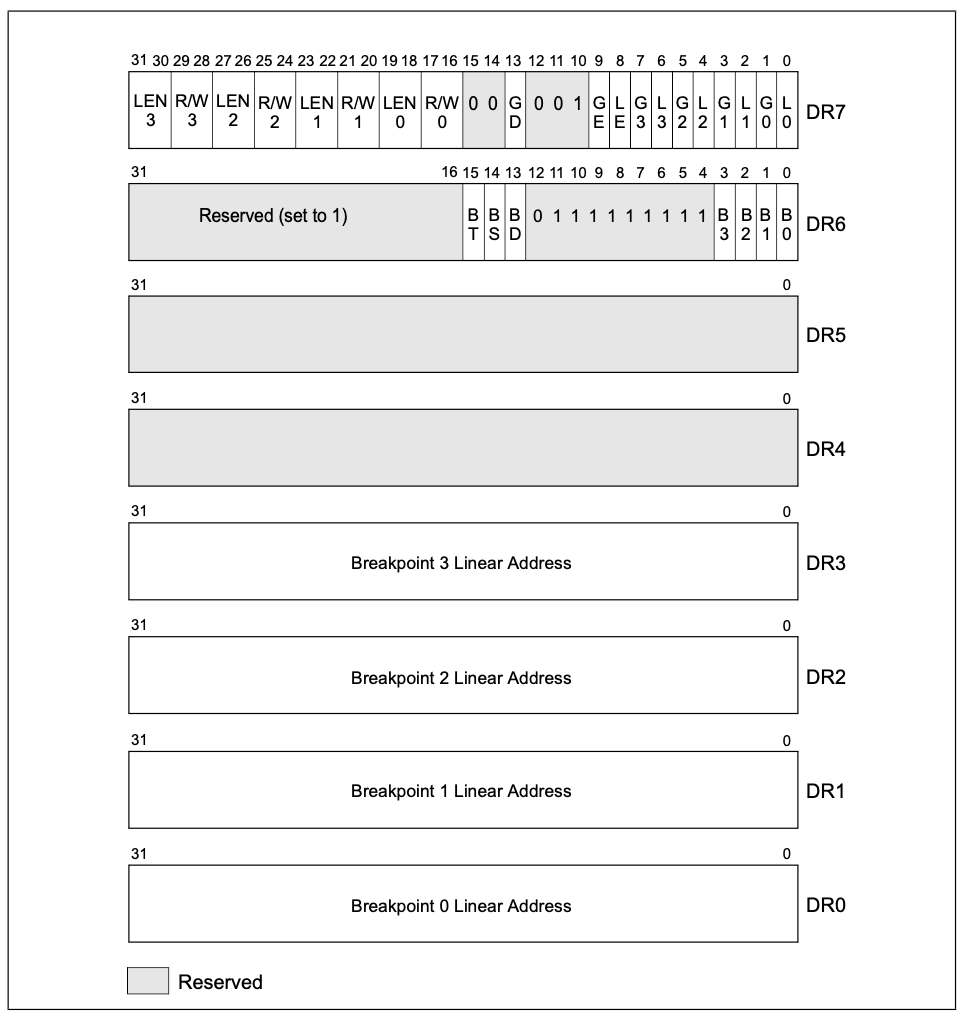 在x86架构CPU的内部内置了一组调试寄存器,从DR0到DR7,总共8个。通过在DR0-DR3中设置要监控的内存地址,然后在DR7中设置要监控的模式,是读还是写,剩下的交给CPU就好了。