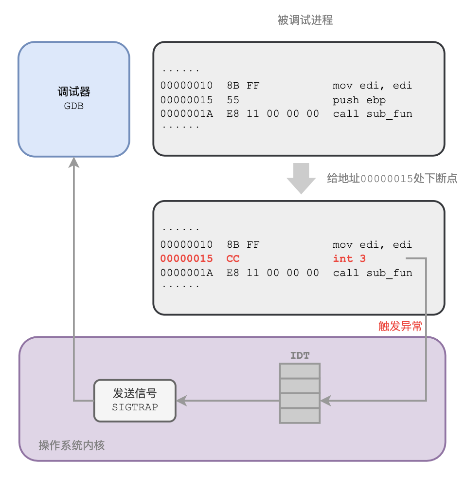 一旦被调试的进程运行到那个位置,CPU执行这条特殊的指令时,会陷入内核态,然后取出中断描述符表IDT中的3号表项中的处理函数来执行。