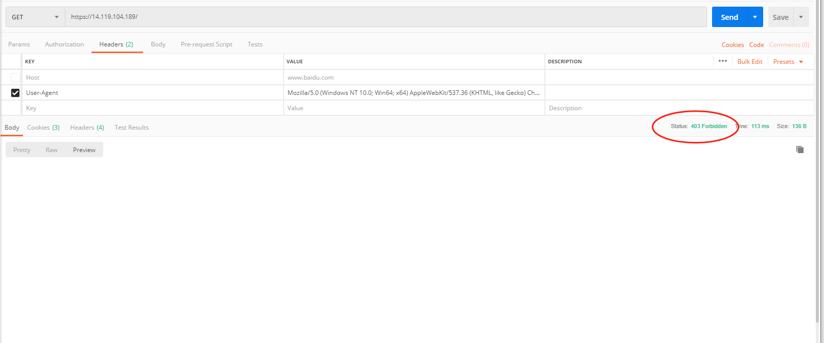 为了进一步验证,我们使用Postman来直接访问https://14.119.104.189,可以看到服务器返回了403错误!
