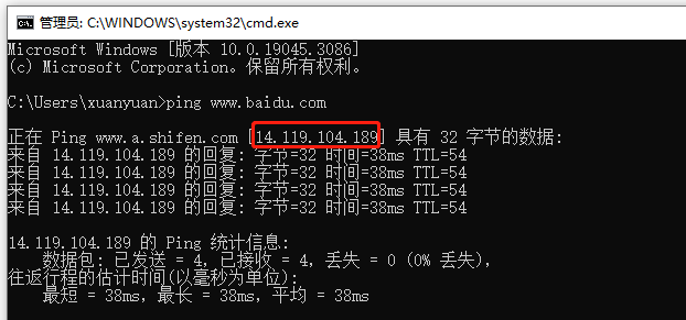 以百度为例,我们ping一下百度的域名,拿到它的IP地址。