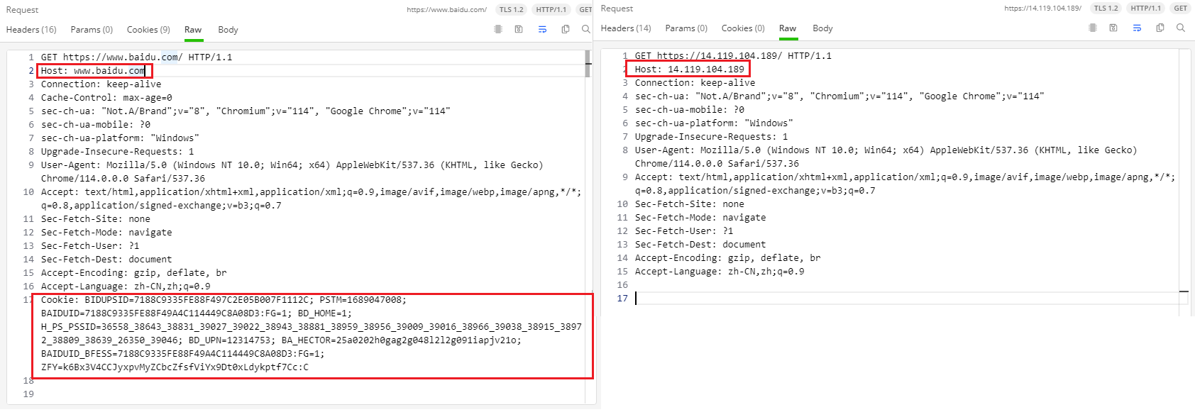 从这个图中就可以合理的怀疑,是不是第二步中,客户端发过去的HTTP请求在使用域名和直接使用IP地址的时候有所不同,让服务器“察觉”出来你是直接使用的IP地址在访问网站,跳过了第一步。