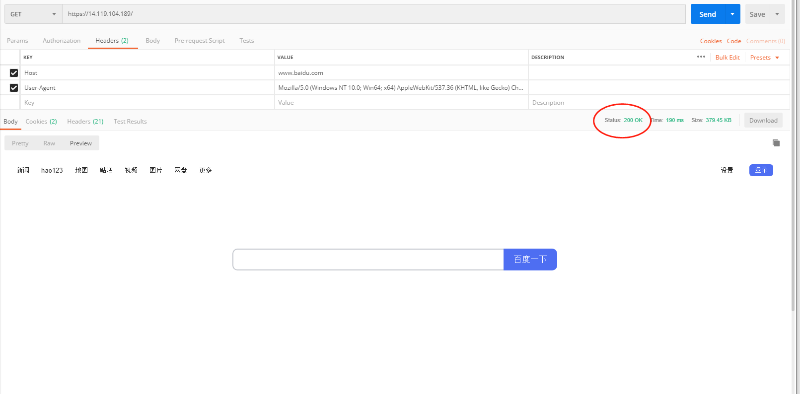 然后,我们通过Postman修改一下Host字段,将其设置为域名www.baidu.com,再试一次: