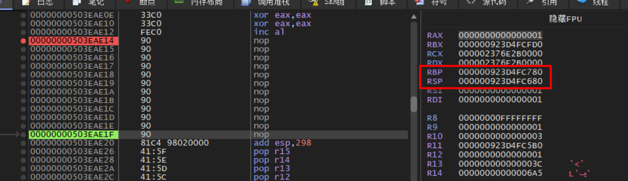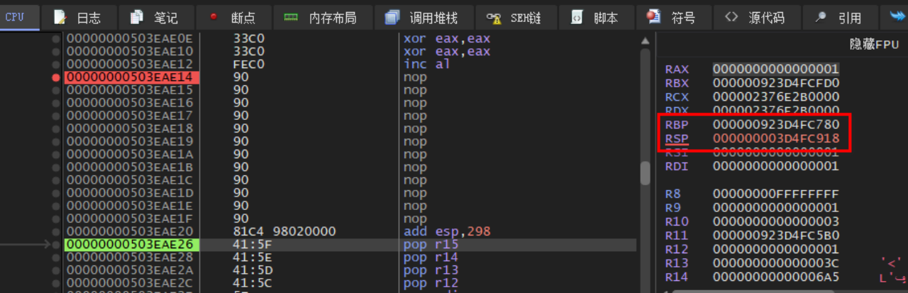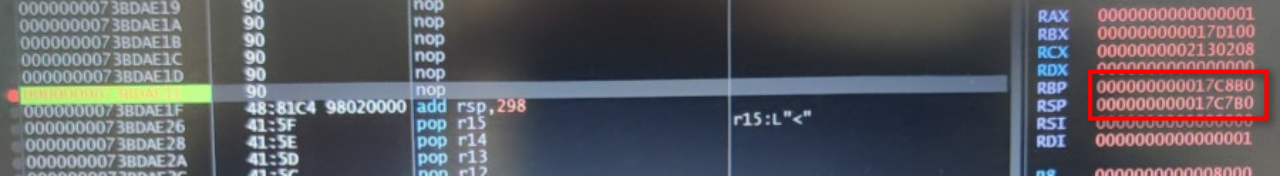 发现了一个很可疑的点,在执行了add esp, 298之后,相比rbp,rsp丢失了高32位,这也就是说……高32位被置零了?