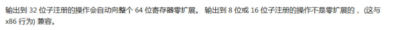 换句话说,操作32位寄存器时会自动将64位的寄存器进行0扩展(即填充0),而16位和(高低)8位则不会。