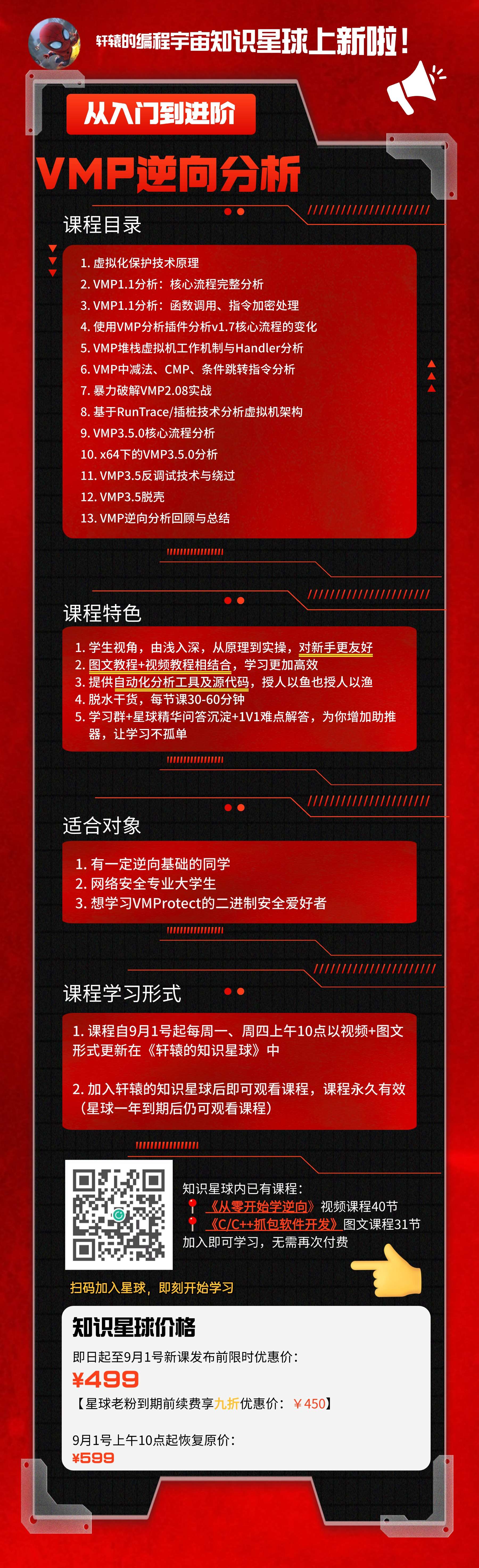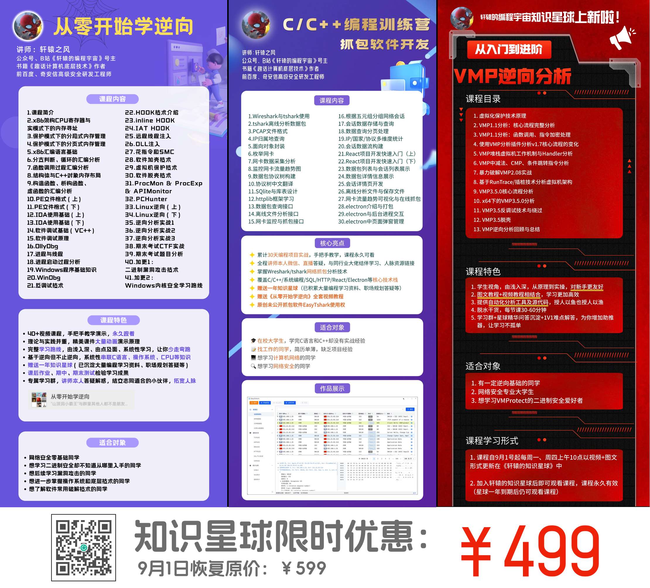 不过,之前299价格肯定是不行的了,星球里面已经有《从零开始学逆向》、《C/C++抓包软件开发》两门课程,再加上这一次的《VMP逆向分析实战》,怎么说299都是贱卖了,所以,星球肯定得涨价了!