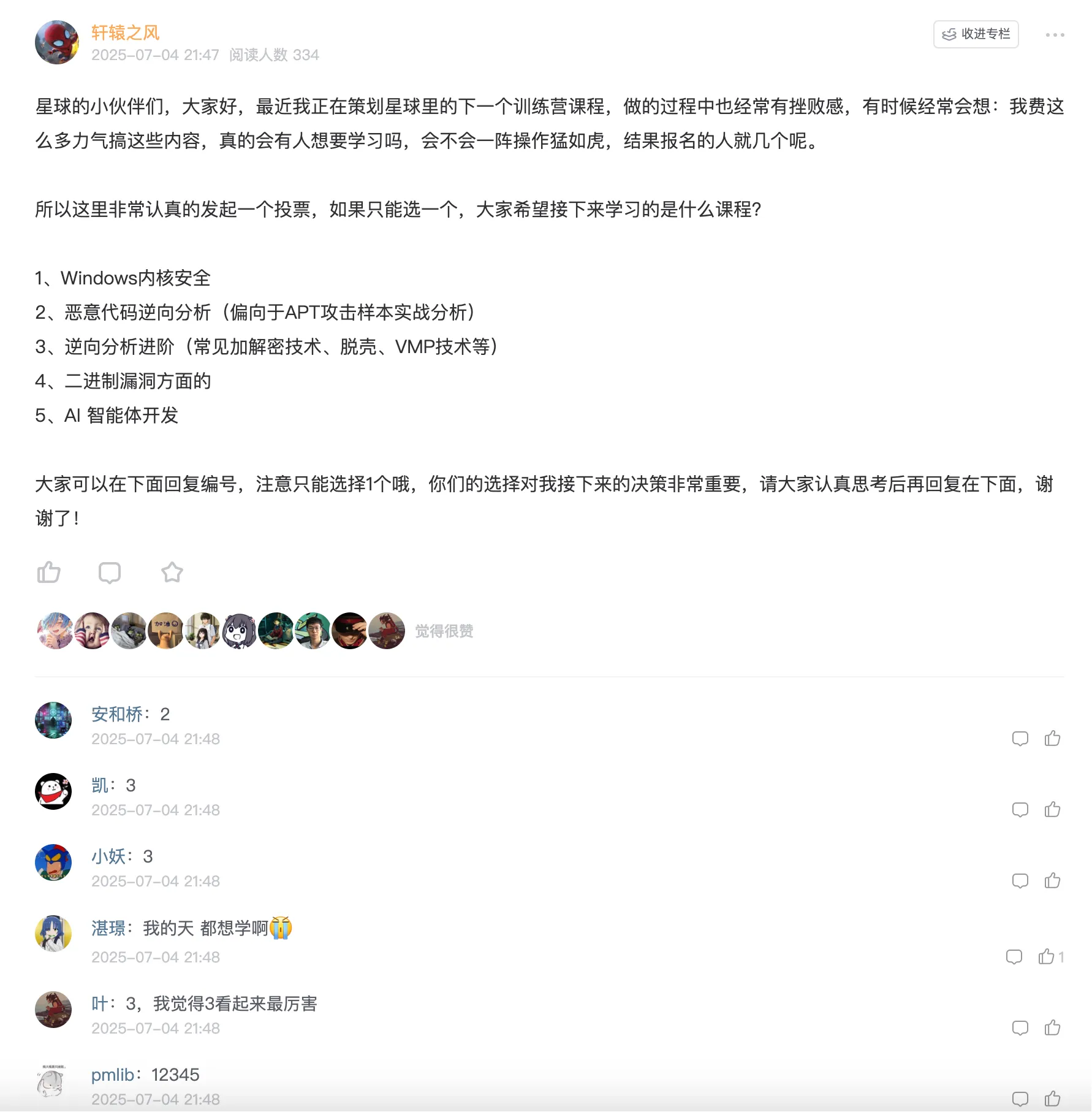 在上个月初的时候,我在知识星球里发起了一个投票,让大家选择最想学习的内容,有很多同学都参与了留言投票。