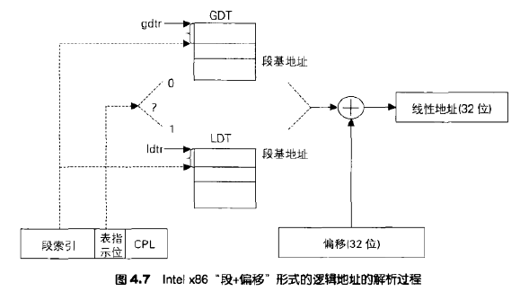 在寻址的时候,CPU首先根据段寄存器中的号码,通过gdtr或ldtr来到GDT/LDT中取出对应的段描述符,然后再取出这个段的基地址,最后再结合段内的偏移,完成内存寻址。