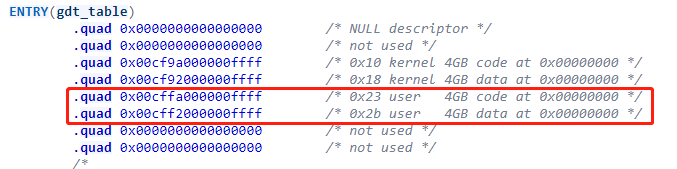 Linux下我没有找到可以直接用什么命令或者工具查看GDT的方式(如果你知道记得一定告诉我哦),于是去源代码中寻找答案: