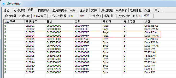 GDT是位于操作系统内核地址空间中的,在Windows上有两种查看方式,一种是通过Windbg,一种是通过一些ARK工具,我这里选择使用PChunter这个神器进行查看。