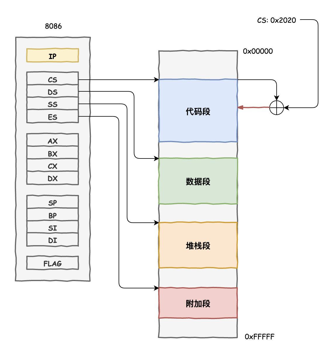 早在16位的8086时代,CPU为了能寻址超过16位地址能表示的最大空间(64KB),引入了段寄存器。