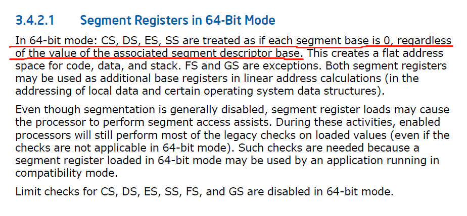 在Intel的指令手册中,关于64位下的段寄存器是这样描述的: