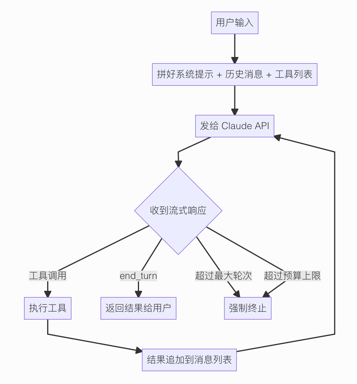 循环里不停地调工具——读文件、改代码、跑终端命令——每次工具跑完,把结果塞回对话历史,Claude 再看结果决定下一步干什么。