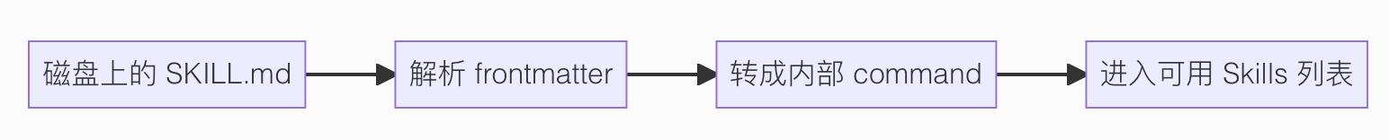 把这些 SKILL.md 文件全部读出来,解析之后,再统一变成内部的 command 对象。