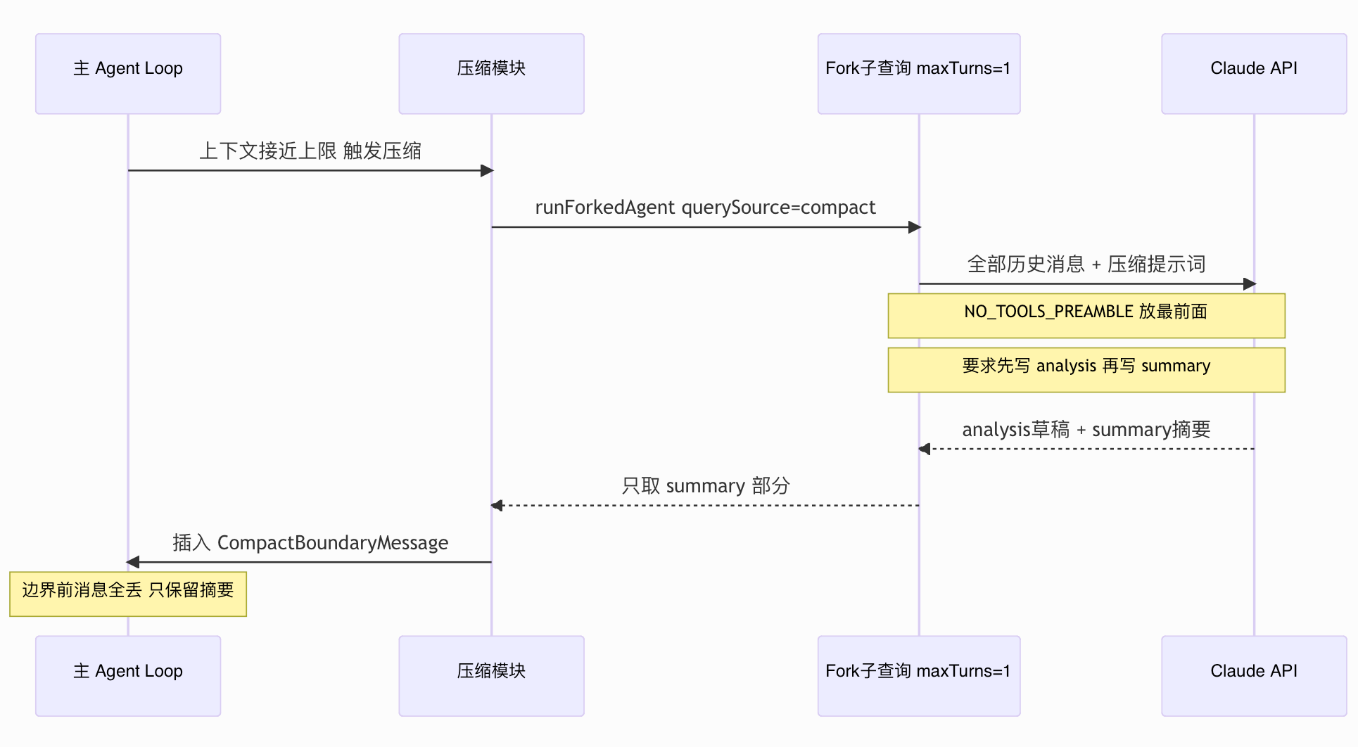 摘要提示词要求模型先写 <analysis> 打草稿,再写 <summary> 作为最终保留内容。<analysis> 块的作用是强制模型做结构化思考,不让它跳过中间步骤直接输出摘要,实践下来摘要质量会高很多。
