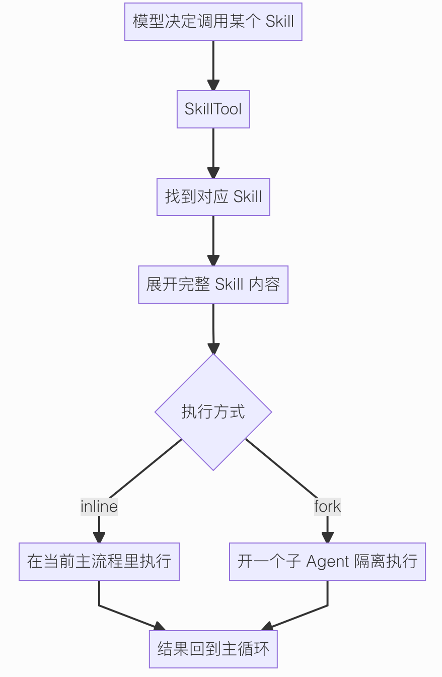 就是把 Skill 直接展开到当前对话里,主 Agent 接着往下做。