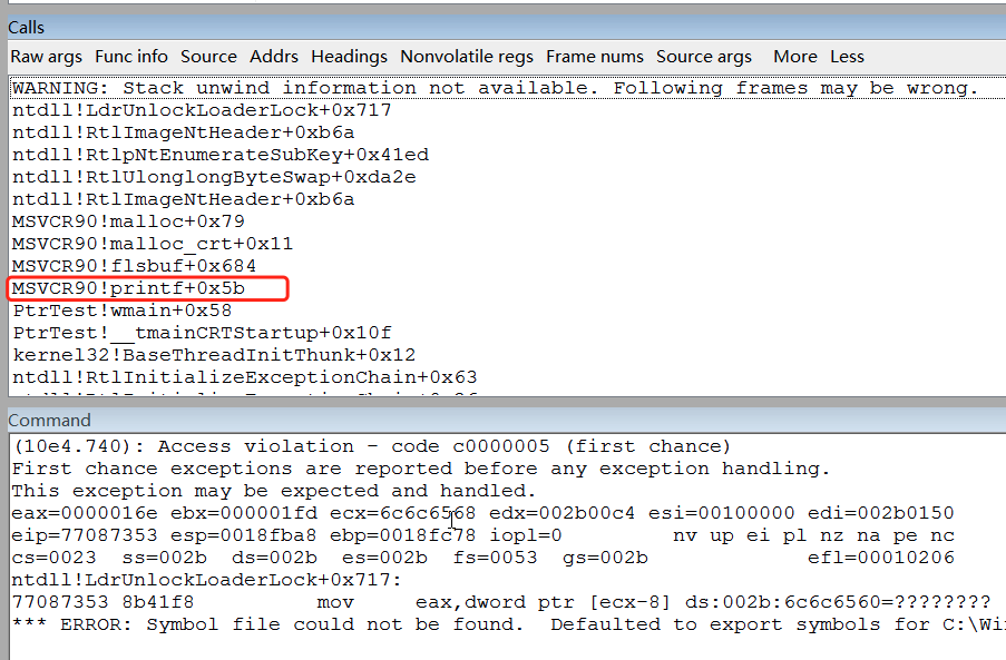 而通过查看崩溃时候的调用堆栈,实际是崩溃在了printf函数内部的调用链条上: