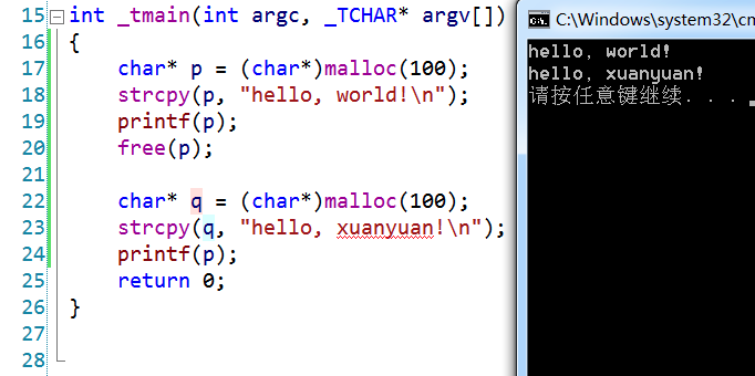 紧接着,我又调用malloc分配了100个字节给指针q,随后给它指向的内存填充了"hello, xuanyuan"。