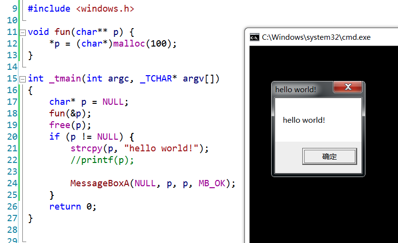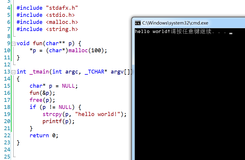 代码很简短,main函数定义了一个指针变量p,然后将其地址传递给fun函数,fun函数使用malloc函数在堆上分配了100个字节的空间,并把这块内存的地址赋值给了p。回到main函数中,紧接着调用free函数释放刚刚分配的内存。