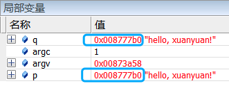 调试一下就会发现,现在p和q两个指针指向的地址是一样的,都指向了同一块内存:
