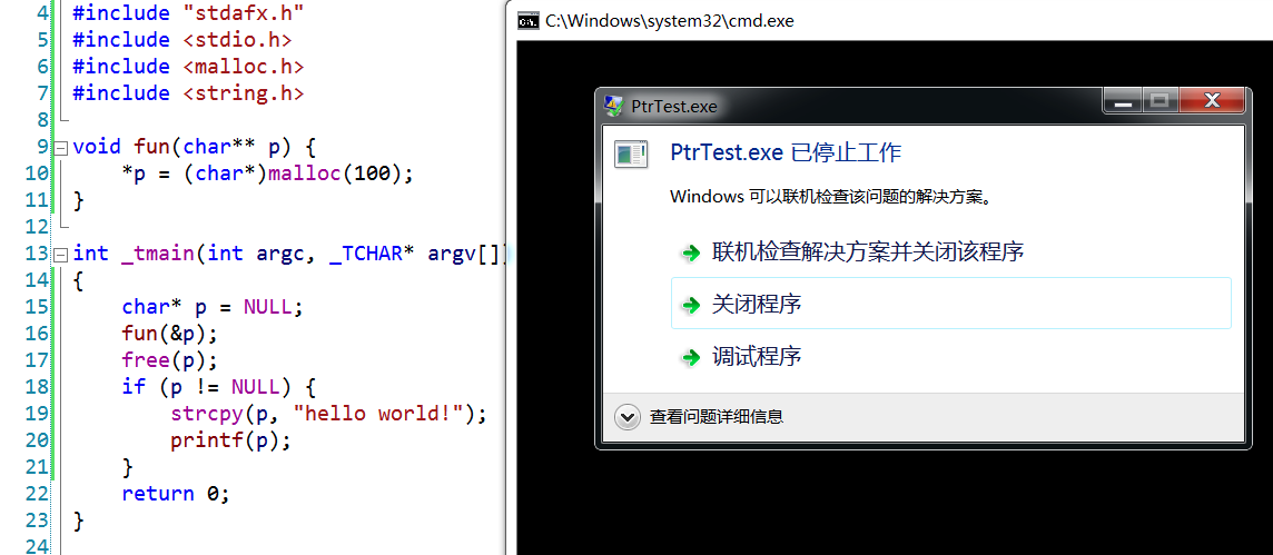 这是利用了C语言运行时库堆内存分配算法的特点,把上面刚刚free归还的100个字节,又分配给新的q了,而p又还没有置空,就出现了p和q同时指向了这块内存。