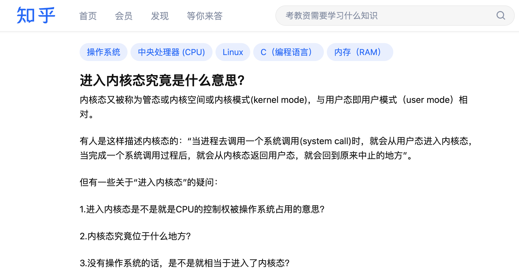 最后,让我们回答最开始知乎的那个问题:进入内核态究竟是什么意思?