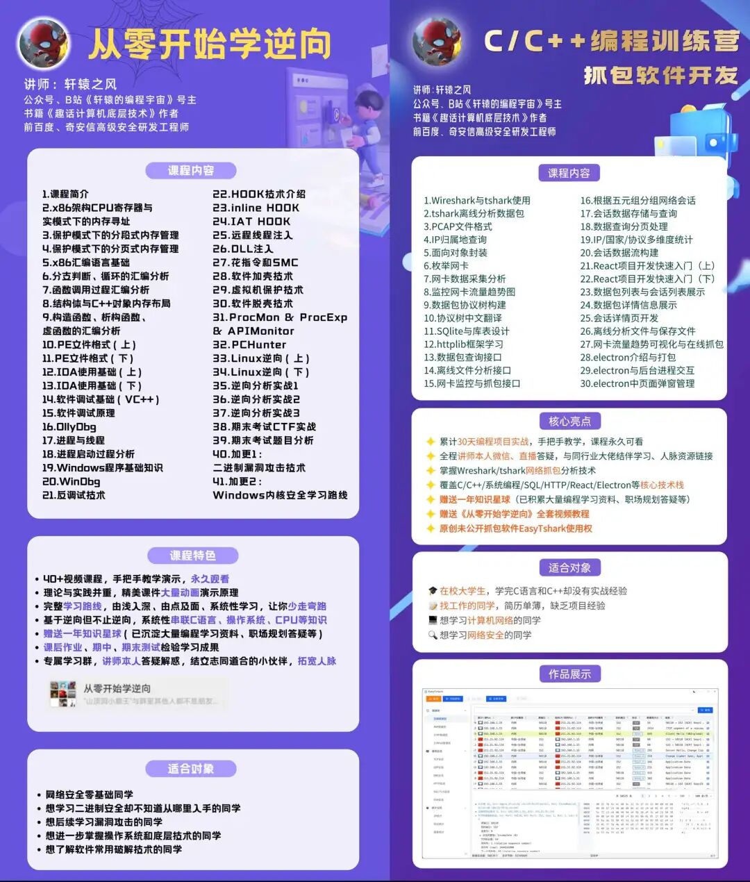 一套是逆向分析视频课程,另一套是C/C++编程开发一套图文课程: