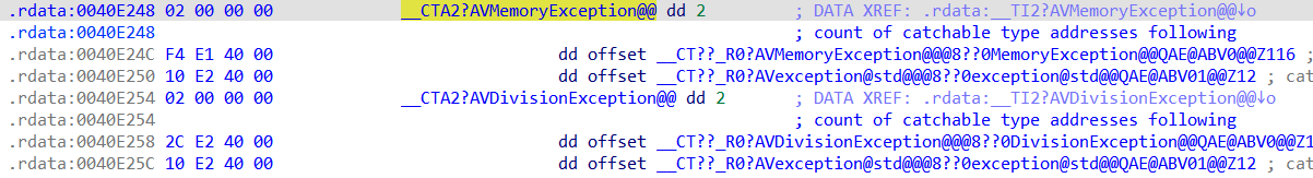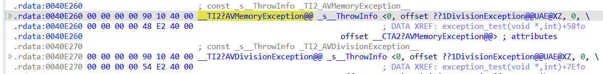 注意看_CxxThrowException函数的第二个参数,_TI2_AVMemoryException__和_TI2_AVDivisionException__,这俩是个啥?点过去看看: