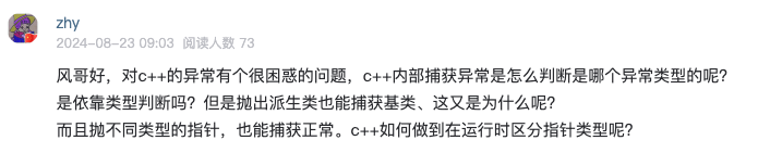 星球小伙伴的第一个问题:这里有两个catch块,当异常发生的时候,程序怎么知道该调用哪个catch块呢?毕竟C++并不像Java,具有反射这样的类型动态识别机制。