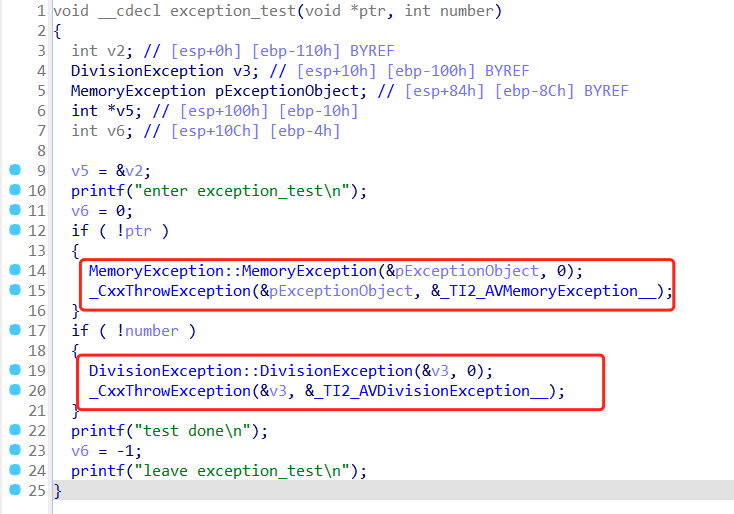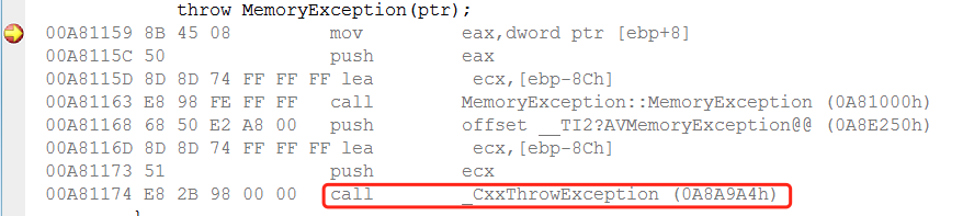 可以看到这里调用MemoryException的构造函数,创建了一个内存异常的C++对象,然后调用_CxxThrowException函数抛出了异常。