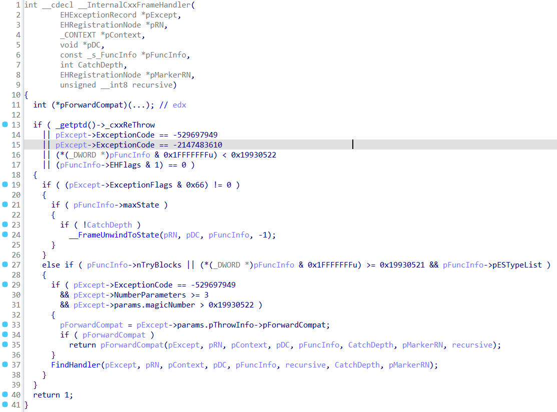 这里面逻辑就要复杂一些了,涉及到栈帧的一些展开处理,因为原来抛出异常的try块里面可能有C++的对象,抛出异常的时候没来得及析构,这里就要做这方面的工作。最后注意看第37那个函数调用,FindHandler,从名字就能看出来,它在寻找一个处理异常的Handler函数。进去看看,这里面逻辑也比较多,看关键部分: