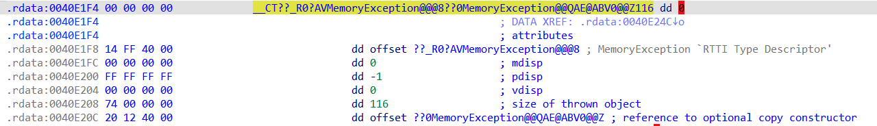 可以看到,这每个里面是有3个DWORD,第一个是元素数量0x00000002,后面两个成员又是一个指针,注意看名字,这里实际上登记的是MemoryException这个类的信息和它的父类exception类的信息。点第一个,也就是0040E1F4那个过去看看: