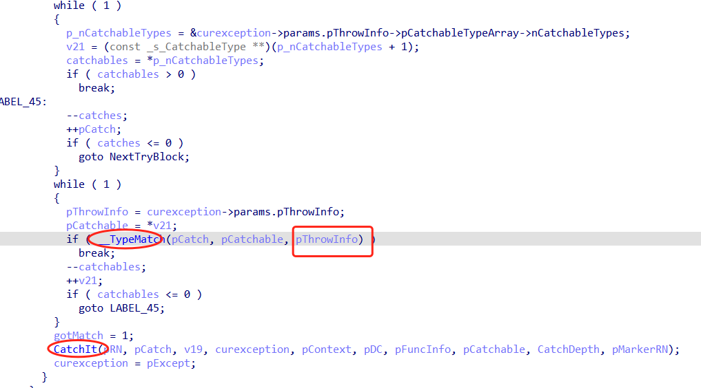 在这个函数中,它会拿到前面抛出异常的类型信息,然后和当前函数代码里面的各个catch块信息做匹配,找到类型相匹配的catch块,然后调用它。编译器在编译函数的时候,会把函数里的各个catch块信息保存到PE文件某个地方存起来。