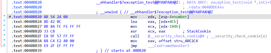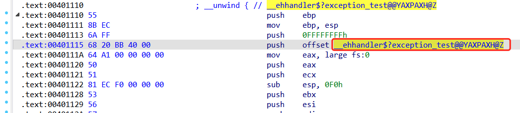 现在我们再来看看,异常处理的函数,来看一下在exception_test函数入口处,安装的结构化异常处理节点中,它里面设置的异常处理函数地址是什么?