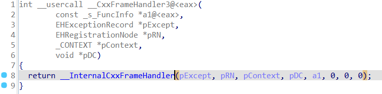 这里做了一点安全检查(__security_check_cookie之前课程介绍过,防止栈溢出攻击的检查,因为SEH的异常处理函数地址也在栈中,所以有这么个检查)之后,跳到了___CxxFrameHandler3这个函数里面去了。而这个函数,就是VC++上,为C++语言提供了异常处理函数的入口,当通过throw抛出异常后,程序就会来到这个函数里去处理异常。不过注意一点,不同版本的VC++这个函数名字可能有稍许的差异。