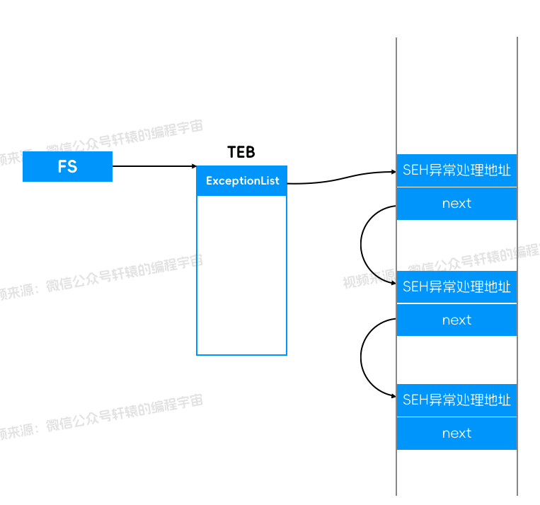 这里面结构化异常处理SEH就是一个重要的机制,多个异常处理函数的地址存放在栈中,通过单向链表的形式串接起来,然后通过FS寄存器指向的TEB中的一个字段进行定位。当异常发生的时候,操作系统库函数就沿着这个链表,依次寻找可以处理当前异常的函数。