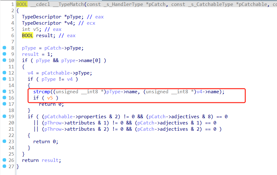 这里面在调用一个循环,在遍历某个数组,然后调用__TypeMatch函数尝试进行匹配,如果匹配上,跳出循环,调用CatchIt,从名字就能猜的出来,这里就在寻找能够处理异常的catch块,找到后,就调用这个catch块。注意看__TypeMatch,它传了pThrowInfo参数,而这个参数前面我们说了,里面包含抛出异常的对象类型RTTI信息。而结合这个__TypeMatch函数名字,就是在做类型匹配。进去看看: