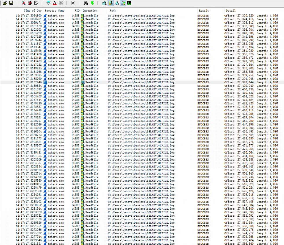 这一看我就发现了,tshark大量在访问SSLKEYLOGFILE.log文件,看到这个文件名,懂行的朋友估计应该知道为啥tshark这么慢了。