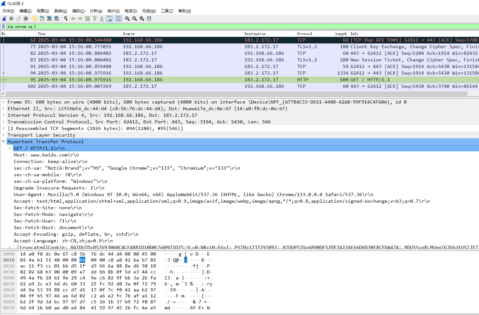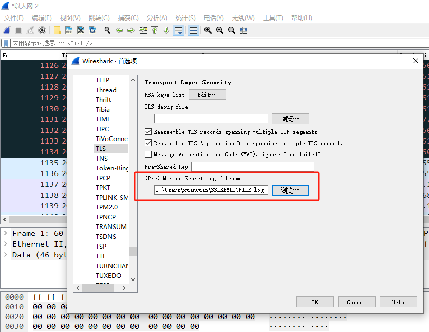添加环境变量之后,我们打开Wireshark来抓包,随后访问网站或者接口了,这个时候,浏览器或者curl这些软件就会把TLS/SSL握手过程中的关键信息记录到这个文件中了。