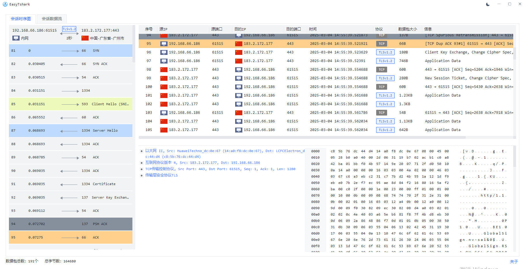 除了前面TCP三次握手和TLS握手阶段,后面传输的数据都是无法解析的加密数据。