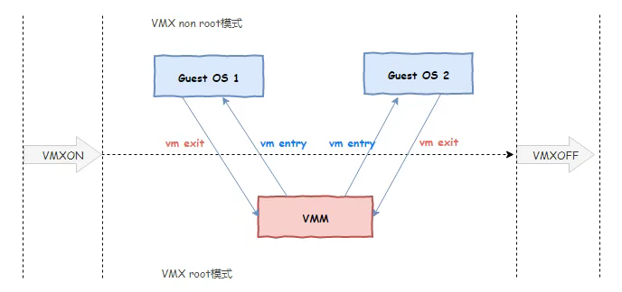 VMM运行的层次,有些地方将其称为Ring -1,VMM可以通过CPU提供的编程接口,配置对哪些指令的劫持和捕获,从而实现对虚拟机操作系统的掌控。